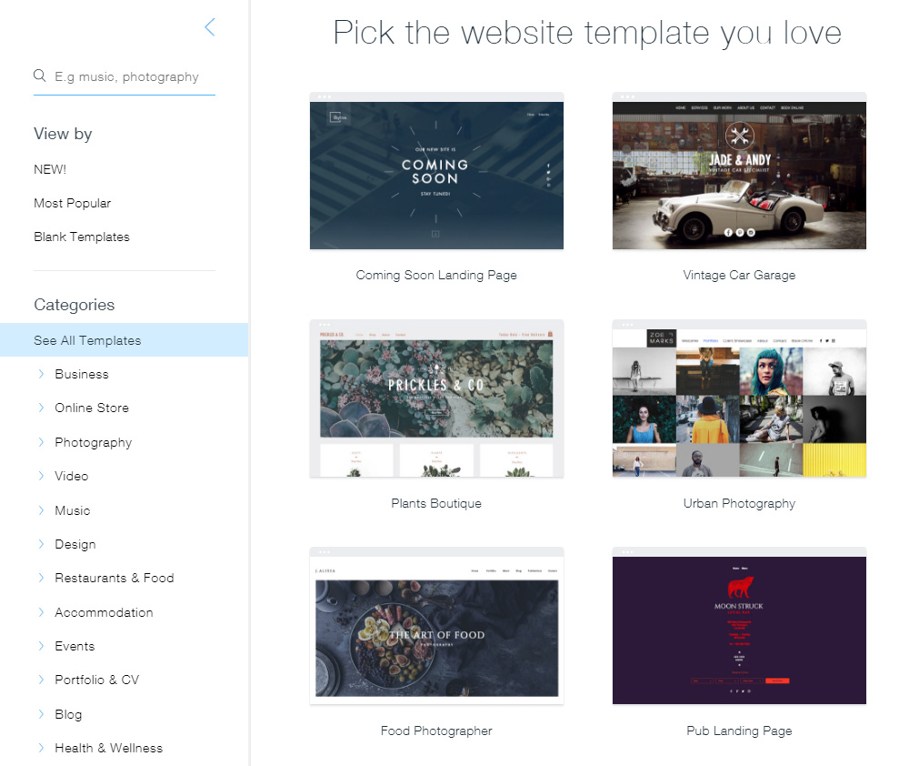Wix features hundreds of gorgeous templates that can be quickly assigned to a site. All major niches are covered, so you won’t have to worry about finding a template to create your unique site. So, whether you’re building a simple blog, hobby site or an official website for your law firm, you’ll have something to work with.